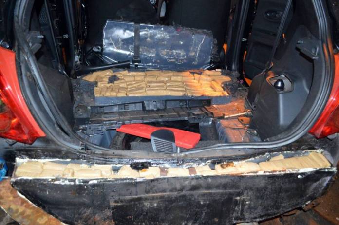 En presencia de testigos, los funcionarios observaron cómo el can detector de narcóticos “Negro” se exaltaba al olfatear el asiento trasero, los zócalos izquierdo y derecho, pilares y paragolpes trasero. Ante este hecho, se extrajeron los asientos y alfombras del automóvil, detectando ocultos 435 paquetes rectangulares, con un peso total de 79 kilos 473 gramos.