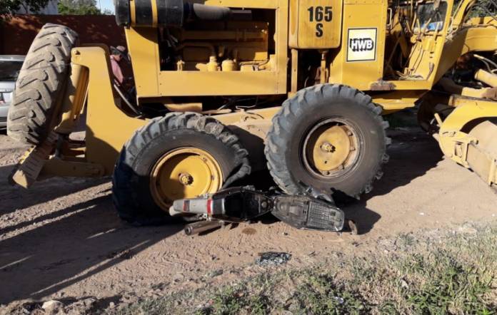 Un tractor que realizaba trabajos de mantenimientos de calles iba retrocediendo, cuando una motocicleta conducida por una pareja se incrustó debajo de ambas ruedas del rodado de mayor porte. La pareja que venía en la moto se tiró a una zanja para evitar ser pisados por el vehículo. No hubo lesionados.