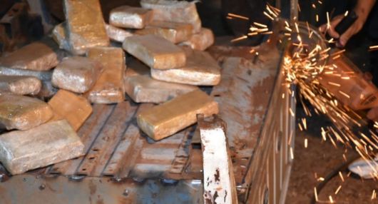 Inmediatamente, los funcionarios, con el uso de amoladoras, hallaron un doble fondo en el sector señalado por el canino. En ese compartimiento se divisaron 85 paquetes rectangulares envueltos en cinta de color ocre.