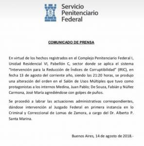 La pelea la inició Medina, quien se acercó de golpe a De Sousa y le pegó “un cachetazo”. Núñez Carmona los separó pero también fue incluido en las “actuaciones administrativas” que labraron los efectivos del Servicio Penitenciario.