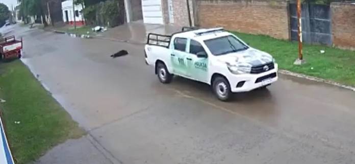 Esta mañana en la localidad de Goya, un patrullero de la Policía pasó por encima a un perro provocando la muerte del animal. Ocurrió en la calle Catamarca casi Juan XXIII en el barrio Scófano y fue registrado por una cámara de seguridad.