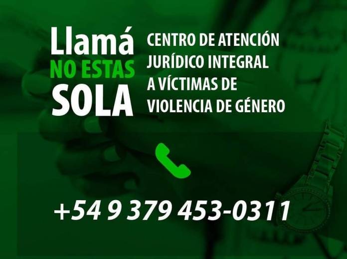El Centro de Atención Jurídico Integral a víctimas de violencia de género continúa atendiendo durante el aislamiento obligatorio. El número es 3794 530311 y lo comunicó mediante las redes sociales el Ministerio de Justicia del Gobierno de Corrientes. Además, la línea nacional es 144, las 24 horas y los 365 días del año. Durante la cuarentena tototal ocurrieron 9 femicidios en la Argentina.31 de Marzo, 2020