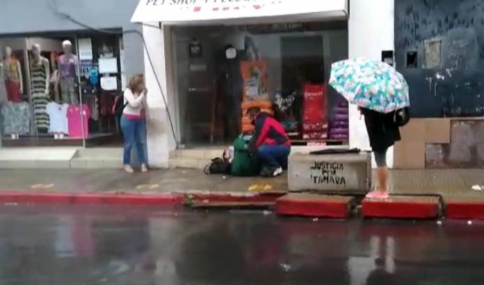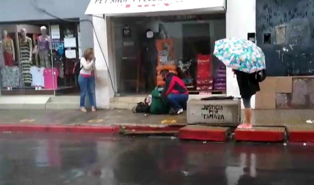 Tras esto, el hombre se paró con el teléfono de la mujer en la mano, ya que se lo había sacado. Ella comenzó a reclamar por su celular y a la vez lo golpeaba en el brazo con un paraguas, que era lo único con lo que contaba para defenderse hasta ese momento ya que había transeúntes, pero sólo observaban. Cuando ocurría esto, la mujer era golpeada por el sujeto que le asestó un puñetazo derecho, lo que provocó la reacción de otro sujeto que atacó al violento. Por algunos segundos, ambos estuvieron frente a frente hasta que volvió la mujer exigiendo su teléfono.