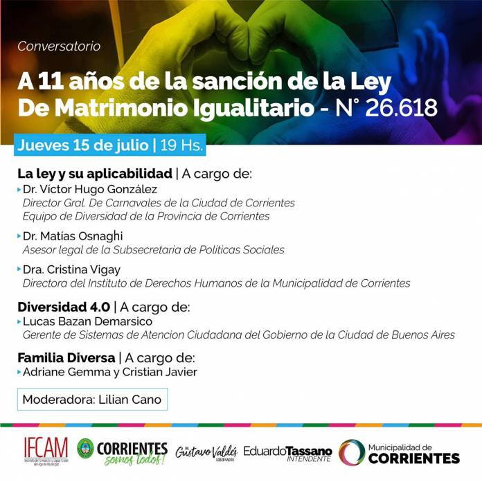 En el marco de los 11 años de la sanción de la ley 26618 de Matrimonio Igualitario el Instituto de Formación y Capacitación del Agente Municipal invita a una reunión de Zoom programada ,este jueves 15 de julio a las 19 hs-
