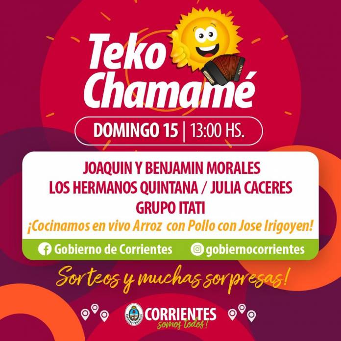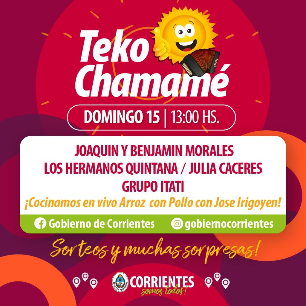En tanto que, el domingo 15, Día de la Niñez, a partir de las 13, formaran parte del Teko Chamamé “Domingo Joaquín y Benjamín Morales”, “Los hermanos Quintana”, “Julia Cáceres” y el grupo “Itati”.