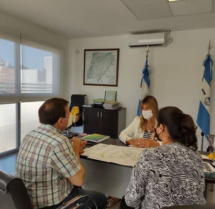 Gabur junto a la directora de Parques Industriales, Natalia Tatarinoff, y el inspector de la obra del Parque por el Ministerio, Pierdo Colombo, mantuvieron una reunión de trabajo en la que repasaron las tareas ejecutadas y las obras restantes.
