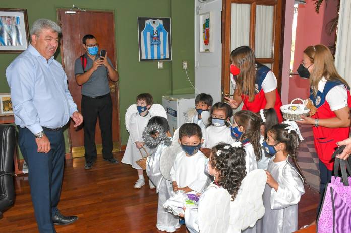 | Jardineritos de la Sala de 3 años del Ipp70, ubicado en la intersección de calles Lamadrid y Chacabuco de Corrientes, fueron recibidos por el ministro de Coordinación, Horacio Ortega, en su despacho, en el marco de esta celebración en la que los niños, disfrazados de ángeles, y a través de cánticos, reciben golosinas como parte de una tradicional ceremonia que se repite año a año. La celebración de Ángeles Somos reúne a distintos grupos de niños de diferentes establecimientos educativos y guarderías en las calles de Corrientes. Así, los mismos visitan domicilios y espacios públicos con canciones alusivas, ante la algarabía de los mayores que los estimulan y los premian regalándoles golosinas. |
