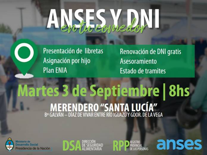 Este martes 3 de Septiembre a partir de las 8 horas el programa “ANSES Y DNI EN TU COMEDOR” estará en el Merendero “Santa Lucia” ubicado en Díaz de Vivar entre Rio Iguazú y Gobernador de la Vega. Este operativo es una acción conjunta de Provincia y Nación.El Ministerio de Desarrollo Social de la Provincia, a cargo de Adán Gaya , a través de la Dirección de Seguridad Alimentaria, Lucas Carballo, en articulación con el Registro Civil coordinado por Marcos Amarilla, realizaran este operativo. Durante estos actividad se proporcionara servicios, estado de trámites y por su parte el Registro Civil actualiza y renueva DNI, en forma gratuita. Este programa es coordinado por Lautaro Regunaga.