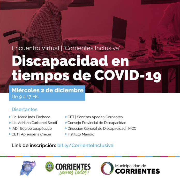 Con el objetivo de seguir acompañando a las personas con discapacidad y sus familias, este miércoles de 9 a 17 se realizará un encuentro virtual gratuito denominado “Discapacidad en tiempos de Covid-19”. La charla, con disertaciones de diferentes especialistas, se podrá seguir a través de la plataforma Zoom, inscribiéndose previamente a través de bit.ly/CorrientesInclusiva