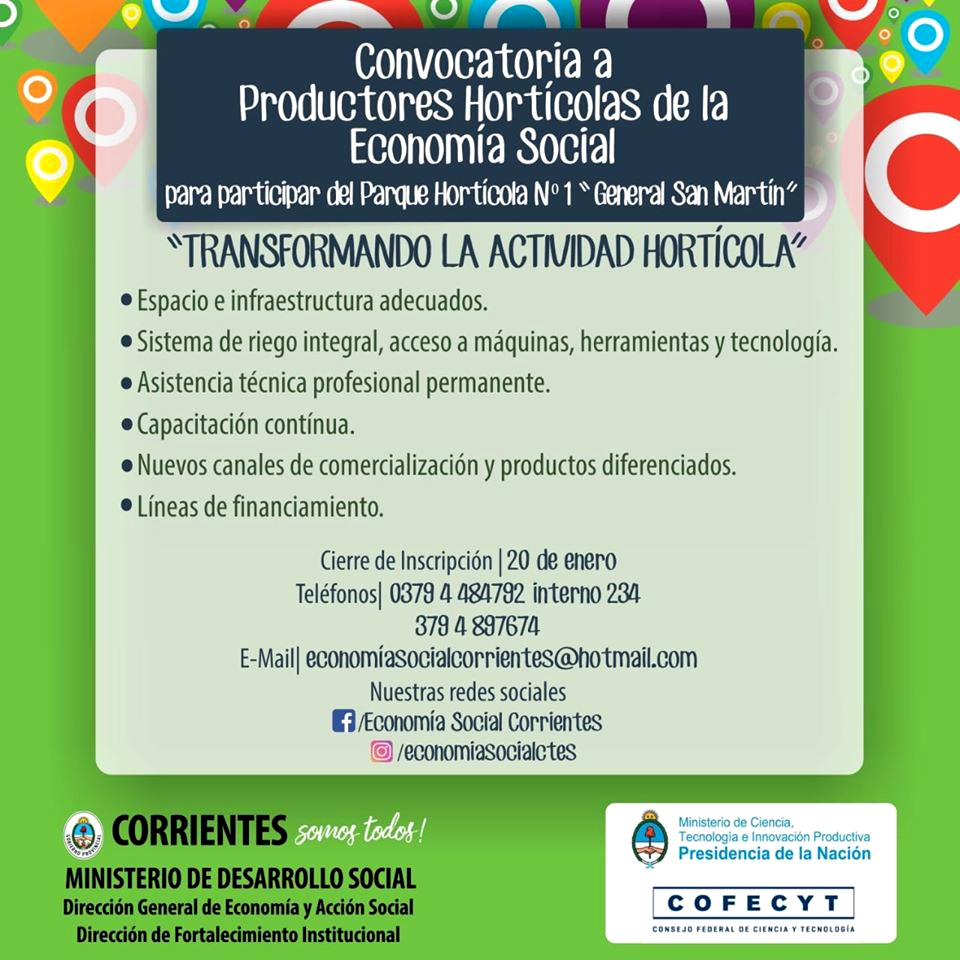 El Ministerio de Desarrollo Social de la provincia a cargo de Adán Gaya,  y a través de la Dirección de Fortalecimiento Institucional a cargo del Prof. Alvaro Rodríguez;  convoca a productores hortícolas de la economía social que quieran participar del proyecto Parque Incubador de Emprendimientos Hortícolas.