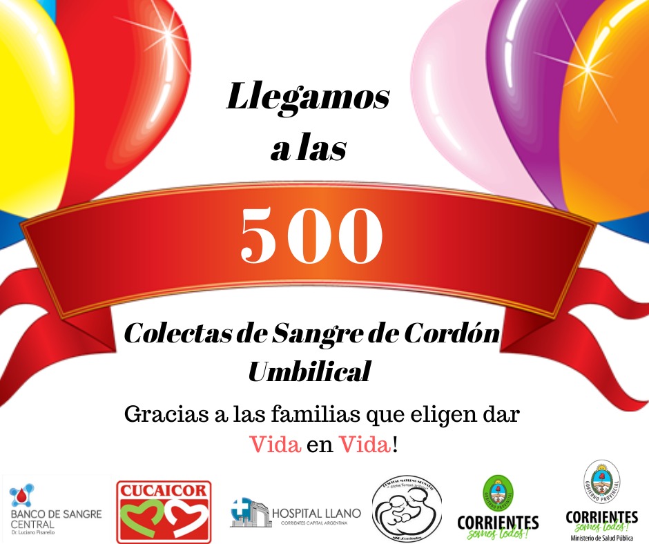El Banco de Sangre Central de Corrientes, informa que a poco más de un año de haberse llevado a cabo la primera colecta de sangre de cordón umbilical en la Maternidad de la Dulce Espera del Hospital Ángela Iglesia Llano, la Provincia alcanzó la cifra de 500 donaciones y sigue batiendo récords. Esto es el resultado de un gran trabajo en equipo pero fundamentalmente de la solidaridad de todos los correntinos.