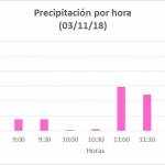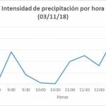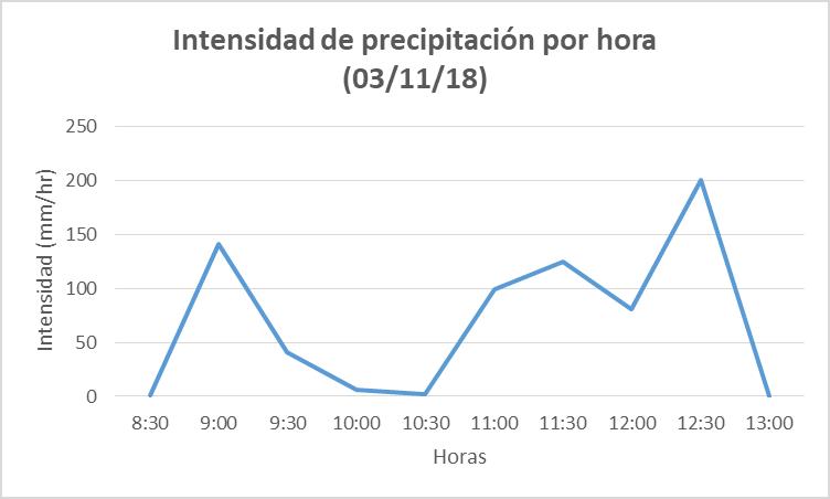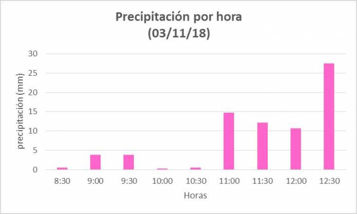 La intensidad de la lluvia fue incrementándose a partir de las 10:30 de la mañana llegó a su punto máximo a las 12:30 horas con 200,4 milímetros de intensidad por hora. En cuanto a las temperaturas, durante la jornada del día sábado 3 de noviembre, la máxima alcanzo los 26,4ºC, ubicándose unos 4ºC por debajo de la máxima del día anterior. Mientras que la mínima marcó 21,7ºC.