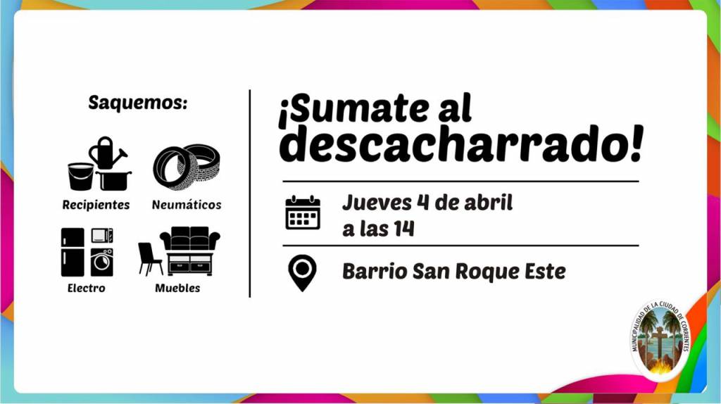 Desde las 14, los vecinos del sector podrán sacar a las esquinas todos aquellos cacharros que se encuentren en sus patios, como ser cubiertas, electrodomésticos viejos, botellas y cualquier otro elemento en desuso, para que puedan ser retirados por personal y equipo municipal.
