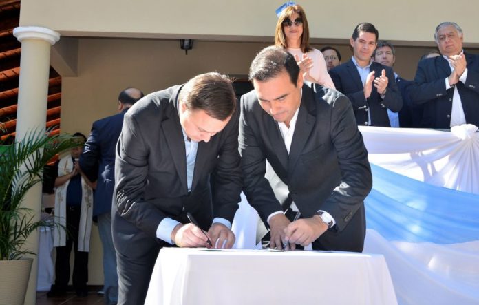 El acto se desarrolló frente a la sede municipal y tras formar con el intendente Elvio Sanabria convenios para pavimentar la avenida “San Antonio” a lo largo de 10 cuadras en doble mano  con iluminación por un monto de 24 millones de pesos y para enripiar 11 kilómetros de la RP 115 por 6 millones de pesos, uniendo las RP 38 y RP 19, el mandatario provincial se dirigió  a los presentes, invitándolos a “sumarse a una nueva etapa que es la transformación de la provincia”.