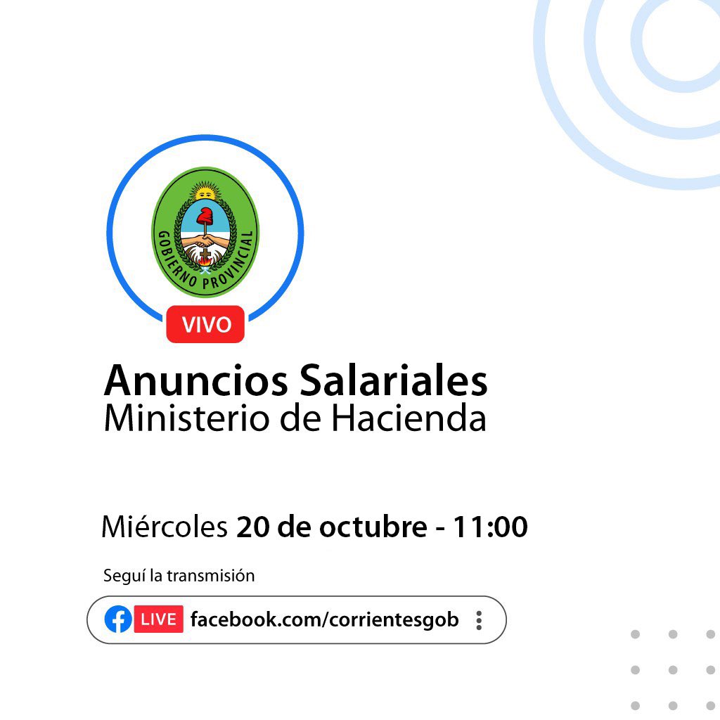 El Gobierno de Corrientes llevará adelante este 20 de octubre, desde las 11, una conferencia de prensa para dar a conocer anuncios salariales para trabajadores provinciales, activos y pasivos, de la administración pública provincial. La misma, tendrá lugar en el Ministerio de Hacienda y Finanzas.