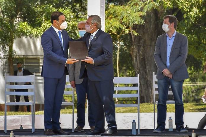 Posteriormente el gobernador de Corrientes hizo entrega al presidente Fernández de una copia del decreto de declaración de Huésped de Honor al mandatario y su comitiva, mientras también le entrego un cofre con tierra de la casa natal del Libertador.