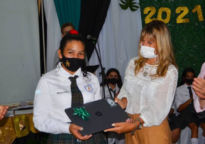 La ministra de Industria, Trabajo y Comercio de la Provincia, Mariel Gabur, participó en Colonia Liebig del acto académico del Colegio Secundario Antonio Biale y como representante de Corrientes ante el Instituto Nacional de la Yerba Mate (INYM) otorgó una notebook a Mercedes Verdún por haber conseguido el mejor promedio general.