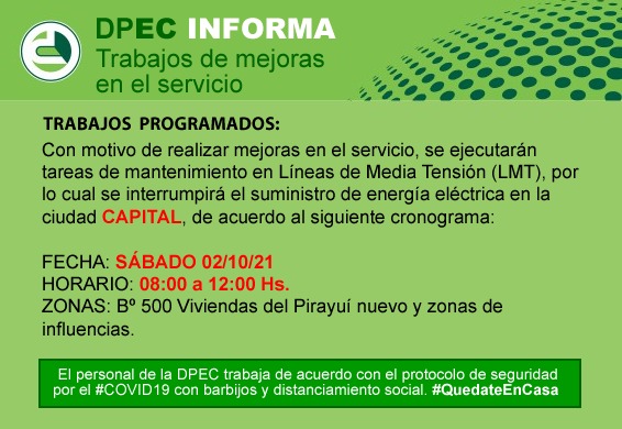 La Dirección Provincial de Energía de Corrientes (DPEC) informa que, con motivo de realizar mejoras en el servicio, se ejecutarán tareas de mantenimiento en estaciones y líneas de media tensión, por lo cual se interrumpirá el suministro de energía eléctrica en las localidades de Capital y Esquina.