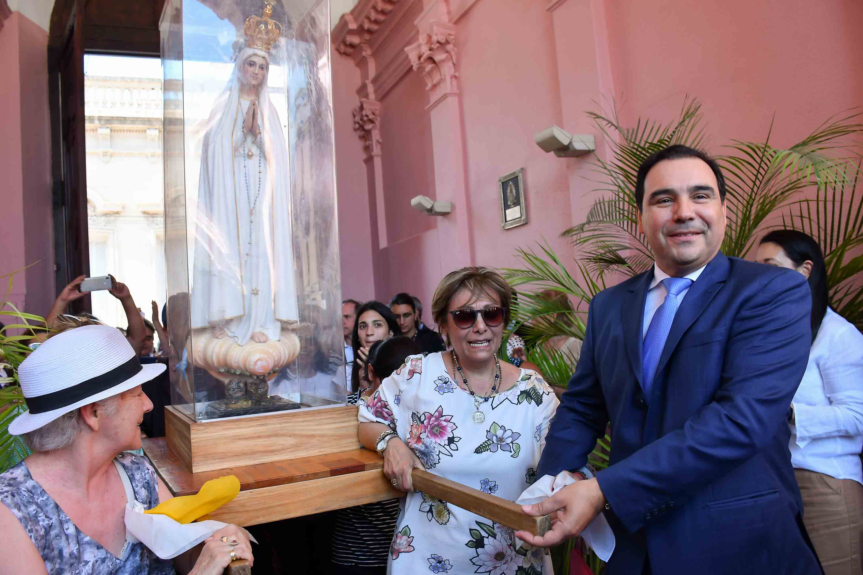 En el marco de un programa de visitas a parroquias, capillas, santuarios, unidades penales, hospitales, centros de menores y de adultos mayores, en distintos puntos del territorio provincial, la imagen peregrina proveniente de Portugal, fue trasladada pasadas las 10 al edificio principal del Poder Ejecutivo, por una comitiva de feligreses encabezados por el Fray Fredy Fernández.
