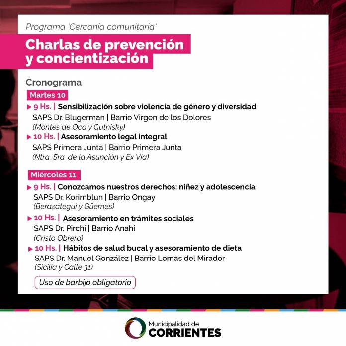 En el marco del programa “Cercanía comunitaria”, las charlas se realizan en todas las Salas de Atención Primaria de la Salud y están a cargo de la Secretaría de Desarrollo Humano. Con todas las medidas de higiene y seguridad, se tratan temas como el cuidado de la salud para la mujer, vacunación e inmunidad, salud bucal, asesoría para trámites sociales. El martes y miércoles las jornadas se llevarán adelante en los barrios Virgen de los Dolores, Primera Junta, Ongay, Anahí y Lomas del Mirador. La Municipalidad de Corrientes continúa realizando diferentes charlas de prevención y concientización en las Salas de Atención Primaria de la Salud (Saps), en el marco del programa “Cercanía comunitaria”. El martes y miércoles las jornadas se llevarán adelante en los barrios Virgen de los Dolores, Primera Junta, Ongay, Anahí y Lomas del Mirador. La acción es llevada adelante por la Secretaría de Desarrollo Humano, con el objetivo de acercar diferentes talleres sobre políticas sociales y de salud. Las jornadas se realizan con todas las medidas de seguridad e higiene, y con un cupo limitado de asistentes. Estas actividades tienen la iniciativa de acercarse a los diferentes barrios, y llevar el servicio a toda la ciudad, para que los vecinos conozcan y puedan acceder a distintas políticas sociales, explicaron desde el área de Desarrollo Humano. Los talleres son dictados por personal municipal y se tratan temas como el cuidado de la salud para la mujer, vacunación e inmunidad, salud bucal, asesoría para trámites sociales, sensibilización y concientización sobre violencia de género y diversidad, hábitos de higiene bucal y asesoramiento de dieta, entre otros. Entre tanto, el martes las jornadas se desarrollarán en los SAPS de los barrios Virgen de los Dolores y Primera Junta, mientras que el miércoles en los barrios Ongay, Anahí y Lomas del Mirador. CRONOGRAMA COMPLETO Martes 10 SAPS Blugerman – barrio Virgen de los Dolores (Montes de Oca y Gutnisky): charla sobre “Sensibilización y Concientización”, 9 horas SAPS Primera Junta – barrio Primera Junta (Nuestra Señora de la Asunción y ex Vía): charla sobre “Asesoramiento legal integral”, a las 10 horas Miércoles 11 SAPS Korimblun – barrio Ongay (Berazategui y Güemes): charla sobre “Conozcamos nuestros derechos: niñez y adolescencia”, 9 horas SAPS doctor Pirchi – barrio Anahí (Cristo Obrero): charla sobre Asesoramiento en trámites sociales, 10 horas SAPS doctor Manuel González – barrio Lomas del Mirador (Sicilia y Calle 31): charla sobre “Hábitos de salud bucal y asesoramiento de dieta, 10 horas |