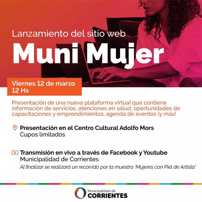 Mañana a las 12 la Municipalidad de Corrientes presentará la plataforma Muni Mujer, en el Centro Cultural Adolfo Mors ubicado en el Parque Camba Cuá. La plataforma Muni Mujer, será un espacio dentro de la página web del municipio destinado a mujeres en donde podrán encontrar todos los programas y proyectos del municipio destinado a este público.