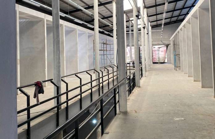 Actualmente los trabajos se centran en la colocación de cielorraso, pintura e iluminación del edificio a efectos de dejar terminados los 86 box en cuanto a su infraestructura interna incluido el cerramiento frontal de cada uno de los locales comerciales.