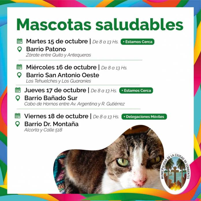 El programa Mascotas Saludables, que lleva adelante la Municipalidad de Corrientes se presentará esta semana en cuatro barrios de la ciudad, en todos los casos en el horario de 8 a 13. El martes 15 estará en el barrio Patono, el miércoles 16 en el San Antonio Oeste, el jueves 17 en el Bañado Sur y el viernes 18 en el Dr. Montaña.