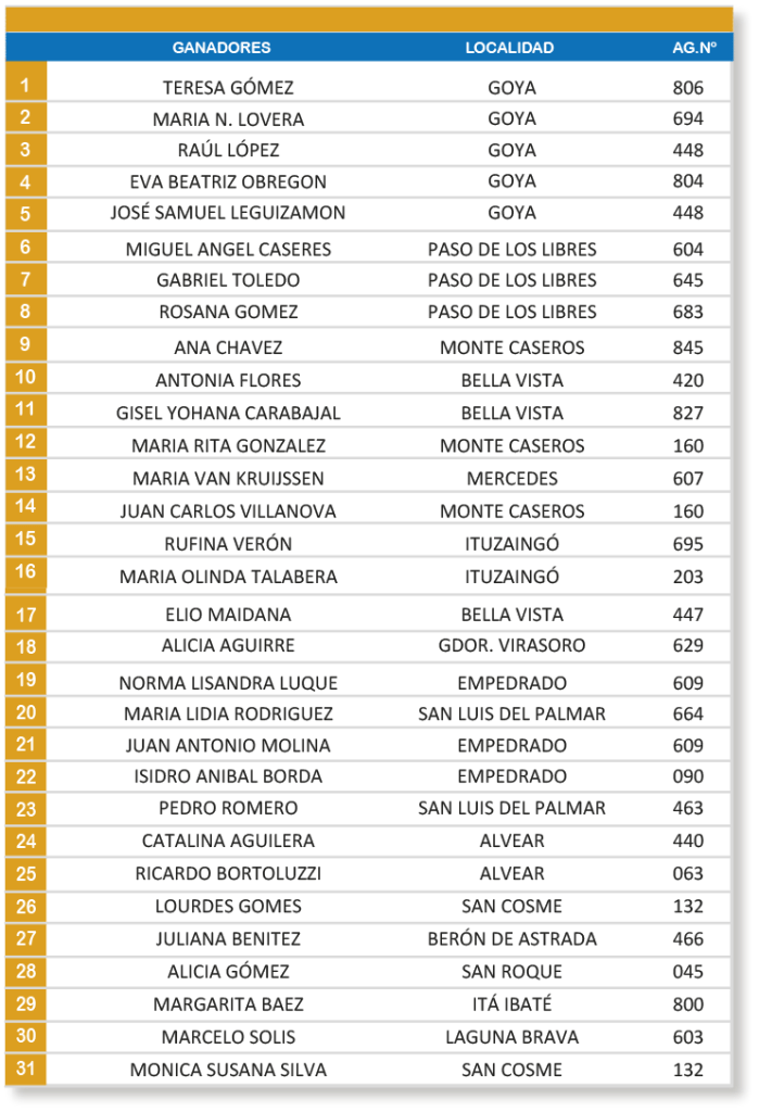 Extractos de Sorteos de Cupones no Premiados: Ciudades del Interior Sorteo realizado en Vivo, el 31 de julio del 2023,a las 14.30 hrs.FELICITACIONES A LOS GANADORES, que se llevan $20.000 Lotería Correntina, cada día te dá más!