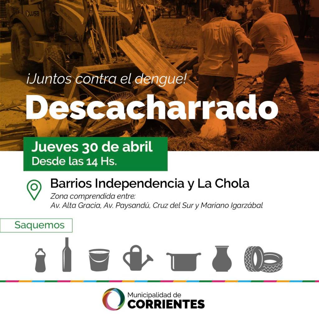 En el marco de la lucha contra el dengue que se viene encarando en la ciudad articuladamente con el ministerio de Salud Pública de la Provincia, la Municipalidad llevará adelante este jueves 30 de abril un nuevo operativo de descacharrado que comprenderá a los barrios Independencia y La Chola.