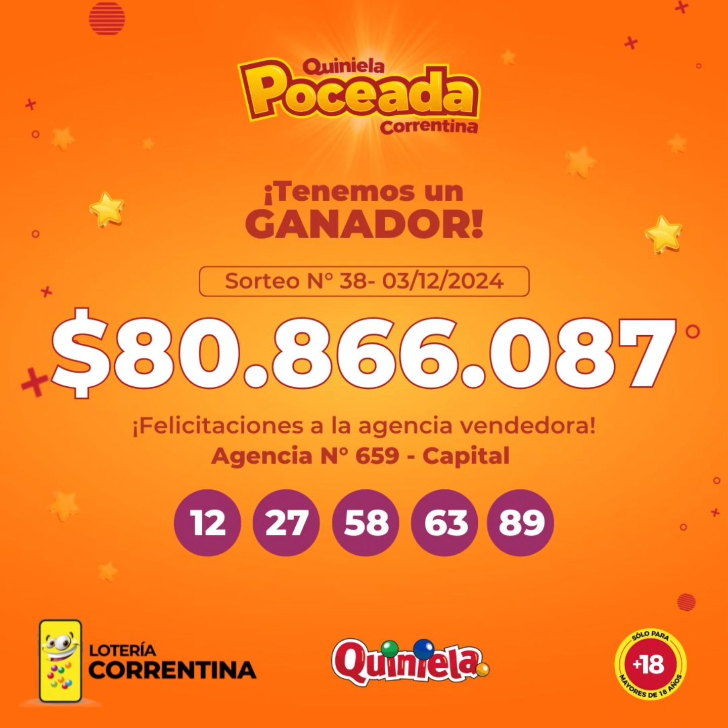 Los números ganadores de esta jornada histórica fueron 12, 27, 58, 63 y 89, y el ticket fue vendido en la Agencia Oficial N°659 de la ciudad de Corrientes Capital.