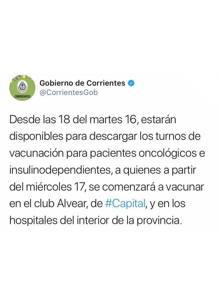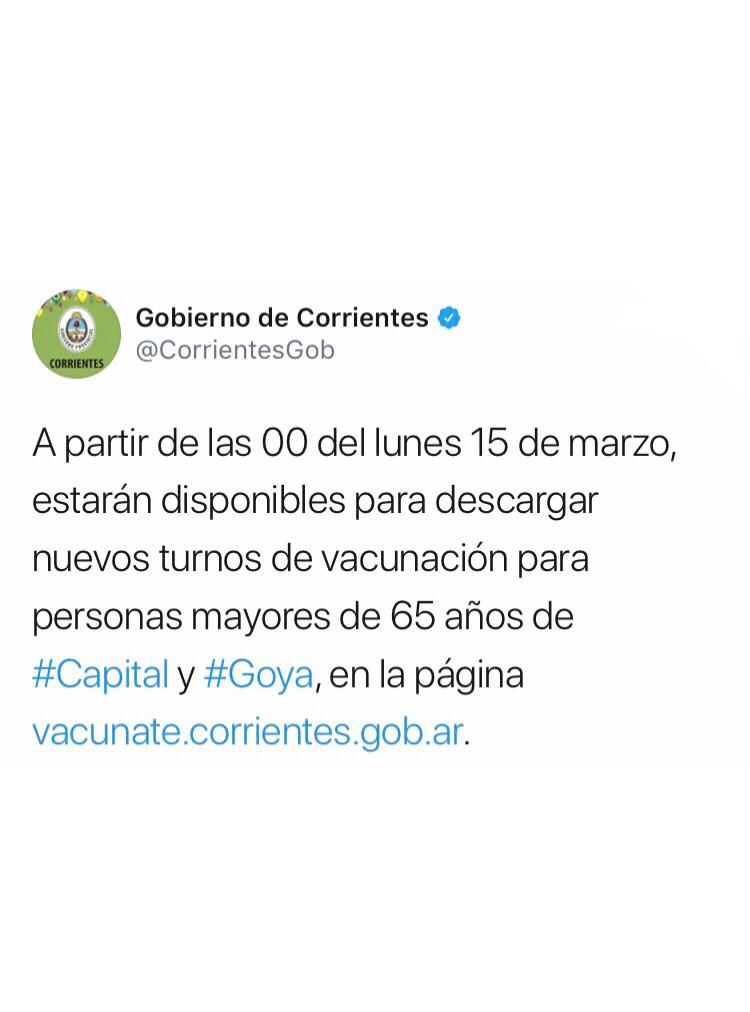 El Gobierno de Corrientes comunicó por medio de su cuenta oficial Twitter (@CorrientesGob) que a partir de las 00 de este lunes 15, estarán disponibles para descargar los nuevos turnos de vacunación a mayores de 65 años de Capital y Goya.