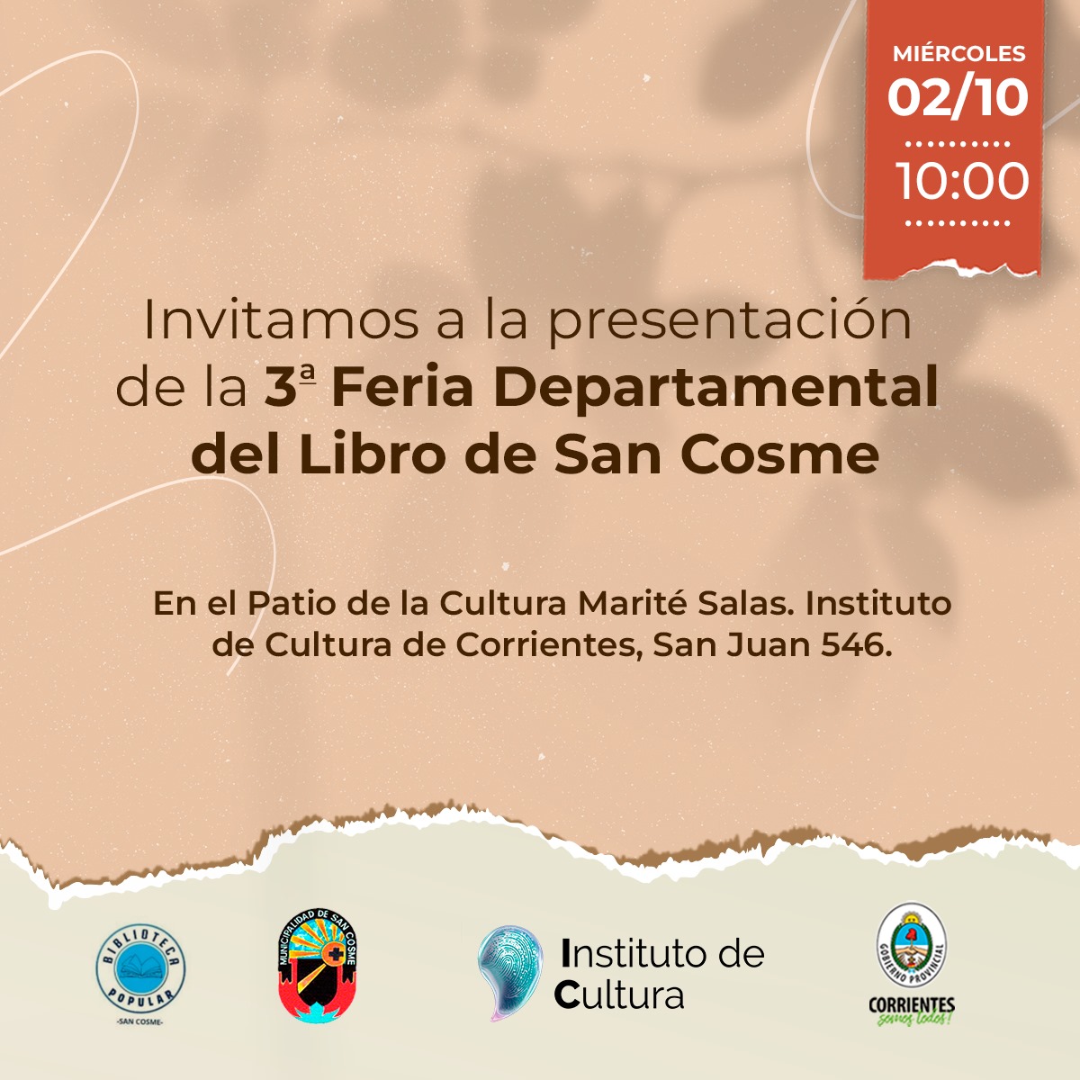Este miércoles 2 de octubre, a las 10, en el Patio de la Cultura Marité Salas del Instituto de Cultura de Corrientes (San Juan 546) se realizará el lanzamiento de la 3ª Feria Departamental del Libro de San Cosme, a desarrollarse del 9 a 11 de octubre, en dicha localidad.