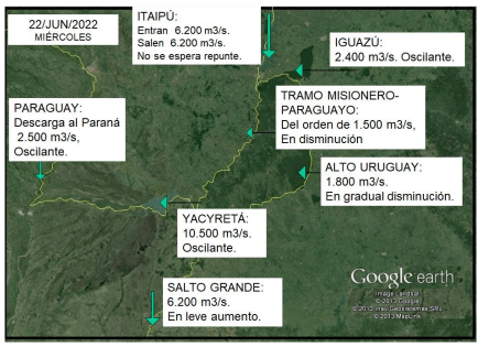 El Instituto Correntino del Agua y del Ambiente (ICAA) publicó el informe semanal del Instituto Nacional del Agua (INA), se indica que de acuerdo a la previsión meteorológica utilizada, para los próximos días se esperan lluvias leves con probabilidades de volverse moderadas sobre el área de aporte al tramo superior del río Uruguay, y más bien leves sobre el área de aporte al tramo Confluencia-Yacyretá y tramo inferior del río Uruguay.
