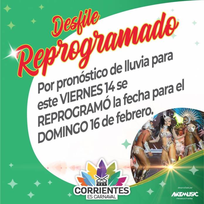 En cuanto a las noches de corsos oficiales en el “Nolo” Alías de la ciudad de Corrientes, desde la organización indicaron que la jornada de hoy viernes 14 se reprogramó para el domingo 16, ya que el pronóstico del tiempo anuncia lluvias para esta parte del país.