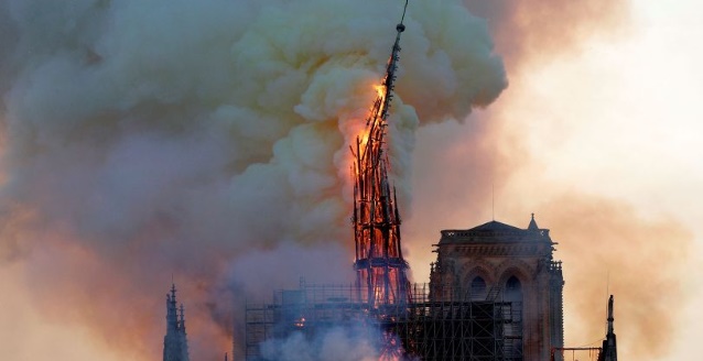 El fuego provocó el derrumbe de la aguja de la torre principal y de la estructura completa del techo, ante la impotencia de los bomberos, que no logran llegar al epicentro del incendio.