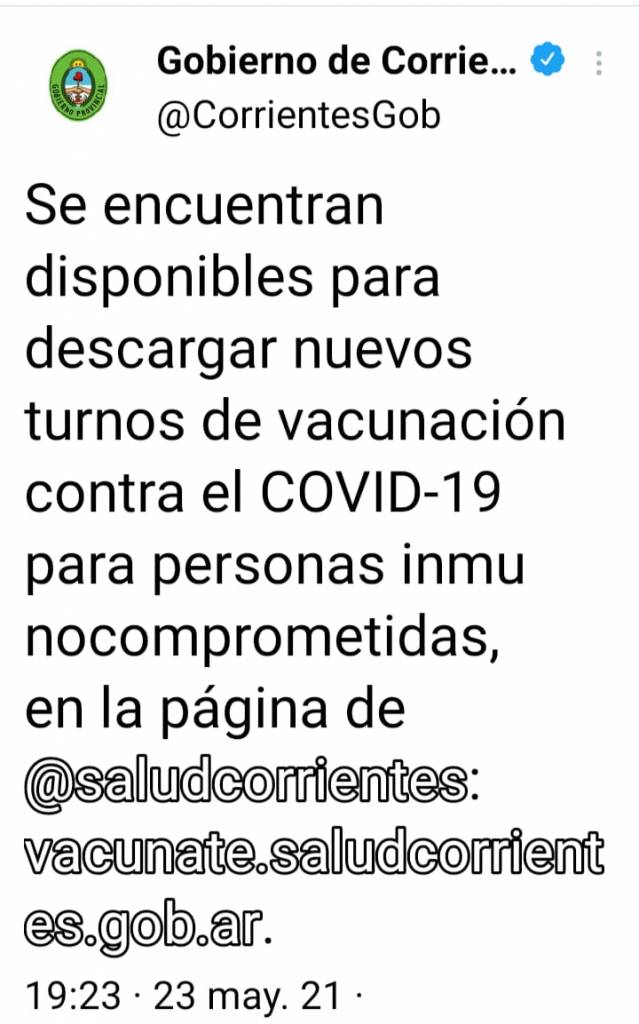 “En el marco de la Campaña de Vacunación covid-19, el Gobierno provincial, a través del Ministerio de Salud Pública, otorgó nuevos turnos para personas inmunocomprometidas para este lunes 24 de mayo. Se pueden descargar en http://vacunate.saludcorrientes.gob.ar“.