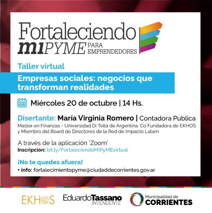 Dando continuidad a las capacitaciones para emprendedores y pymes locales, el miércoles 20 de octubre se realizará un nuevo encuentro. En esta oportunidad, se hablará sobre emprendimientos sustentables, responsables con el medioambiente. Destinado a todos aquellos que deseen desarrollarse en esta área. El taller virtual será a partir de las 14 a través de la plataforma ZOOM. En el marco del programa Fortaleciendo MiPyME que lleva adelante la Municipalidad de Corrientes este miércoles 20 de octubre se llevará adelante un nuevo taller de capacitación gratuita para emprendedores. En esta oportunidad la capacitación será sobre: Empresas sociales: negocios que transforman realidades” a cargo de María Virginia Romero, Co Fundadora de EKHOS y Miembro del Board de Directores de la Red de Impacto Latam desde donde impulsa el crecimiento del ecosistema de empresas sociales en Argentina y Latam. El taller virtual será a partir de las 14 a través de la plataforma ZOOM. La inscripción se la debe hacer a través del siguiente link: bit.ly/FortaleciendoMiPyMEvirtual “En esta oportunidad queremos incluir una formación en emprendimiento sustentable porque nos parece muy importante hablar sobre esta temática que es vital para el desarrollo económico. Queremos mostrar las diferencias que se pueden hacer, muchas veces con muy poco, mediante una transformación de la perspectiva”, señaló la subsecretaria de Pymes e Industria, Thea Beláustegui. Vale mencionar además que la disertante estudió Contador Público y Master en Finanzas en la Universidad Di Tella de Argentina. Se entrenó sobre modelos de negocio de Empresas Sociales en el Centro Yunus de Bangladesh y sobre Ecosistema de Empresas Sociales en India. Además, realiza consultoría a proyectos de impacto social y ambiental positivo. Es mentora de emprendedores sociales de Ashoka, MINKA y GEN E. |