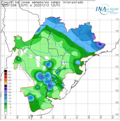 En la cuenca media del río Uruguay, sin lluvias significativas. El aporte de los afluentes volvió a reducirse marcadamente. No se espera un repunte importante en la próxima semana. Los niveles se mantienen temporariamente en la franja de aguas medias, con perspectiva de retornar a las aguas bajas. En Paso de los Libres el caudal promedio 2.570 metros cúbicos por segundo, el doble del valor de la semana anterior, pero en clara disminución. La tendencia climática indica lluvias de normales a inferiores a las normales sobre la cuenca media en el trimestre al 28 de febrero 2021.Se mantendrá la atención en los eventos de corto plazo.