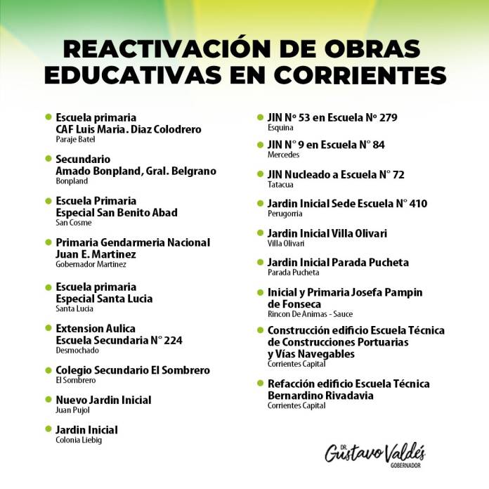 El gobernador Gustavo Valdés anunció este viernes que el Gobierno de Corrientes logró un nuevo avance con el Gobierno de Nación para la reactivación de la obra pública nacional en territorio provincial. En esta ocasión, con el Ministerio de Capital Humano sobre infraestructura escolar.