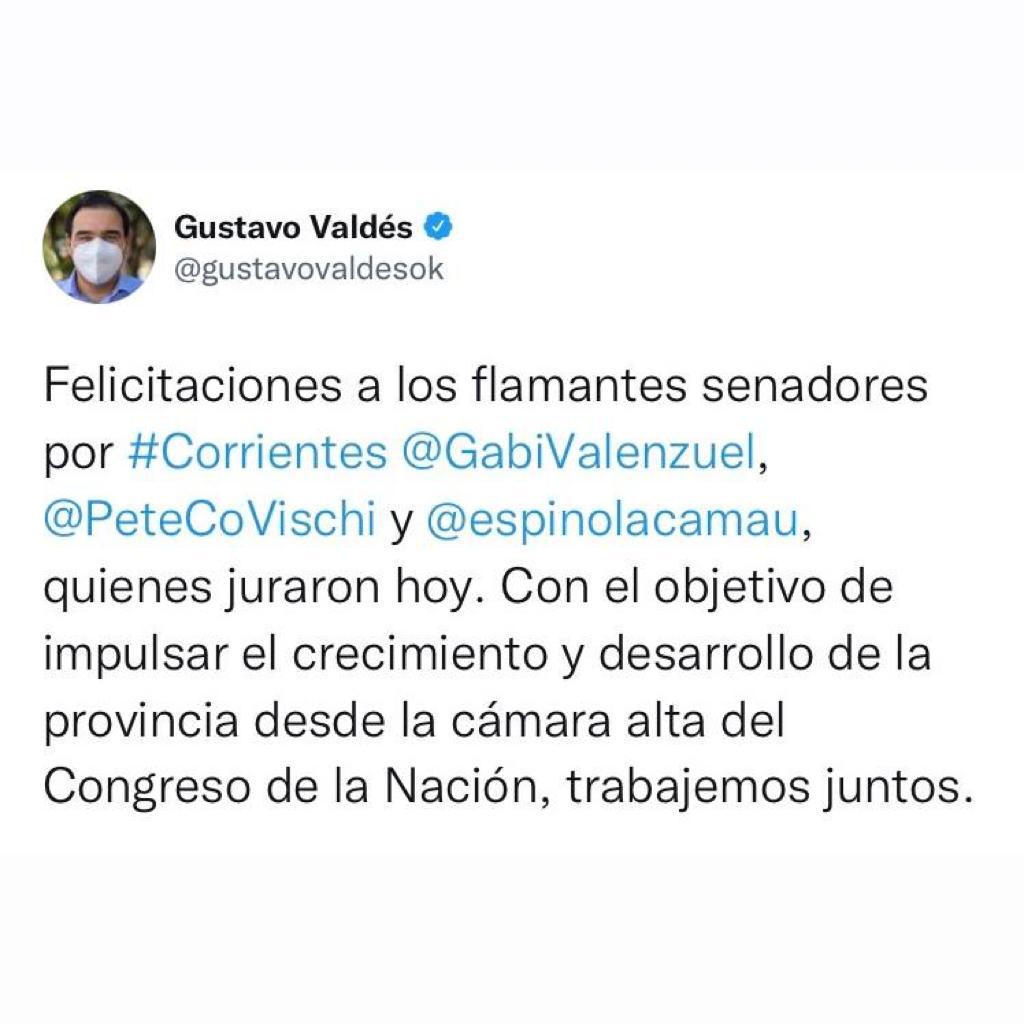 El gobernador Gustavo Valdés expresó sus felicitaciones a “los flamantes Senadores por Corrientes”, Eduardo Vischi, Gabriela Valenzuela y Carlos Espínola, quienes juraron este jueves en la Cámara alta y en donde entrarán oficialmente en función a partir del 10 de diciembre. De esta manera, a través de sus redes sociales el primer Mandatario pidió además que “con el objetivo de impulsar el crecimiento y desarrollo de la Provincia desde la Cámara alta del Congreso de la Nación, trabajemos juntos”.