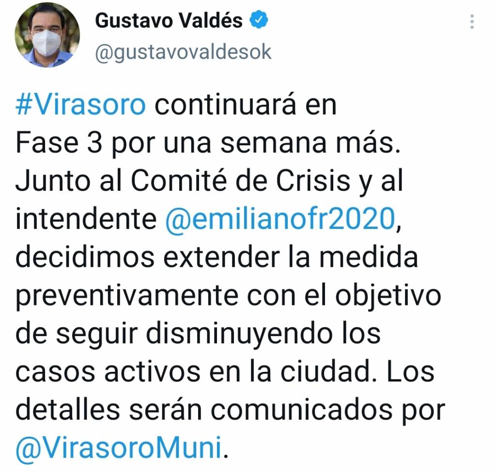 El gobernador Gustavo Valdés comunicó a través de su cuenta oficial de Twitter que la ciudad de Virasoro seguirá en Fase 3 por el transcurso de una semana más; una decisión tomada junto al Comité de Crisis y el intendente Emiliano Fernández.
