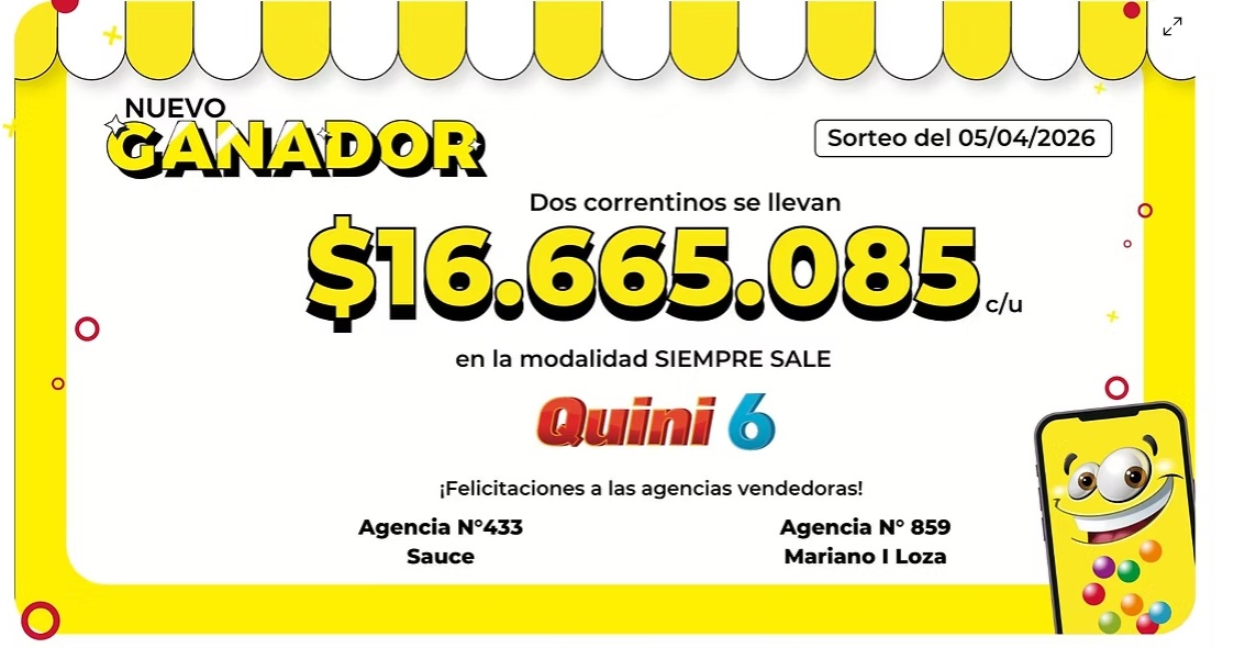 Por su parte, en el sorteo del sábado 5 de abril, otros dos apostadores se sumaron a la lista de ganadores, llevándose $16.665.085 cada uno. En este caso, los tickets fueron vendidos en la Agencia Oficial Nº 433 de Sauce y en la Agencia Oficial Nº 859 de Mariano I. Loza.