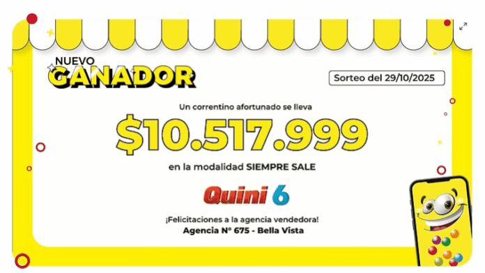 En el último sorteo de la modalidad Siempre Sale del Quini 6, realizado el pasado miércoles, un afortunado correntino de la localidad de Bella Vista se llevó $10.517.999.