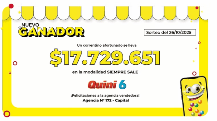 La buena racha continúa en Corrientes. En el sorteo del domingo pasado de la modalidad Siempre Sale del Quini 6, un apostador de la Ciudad de Corrientes se llevó un premio de $17.729.651, tras acertar los números 17 – 29 – 31 – 33 – 39.