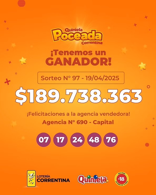 La Quiniela Poceada Correntina hizo historia este sábado 19 de abril al entregar el pozo más grande desde su lanzamiento: $189.738.363, una cifra que marca un antes y un después en este popular juego.