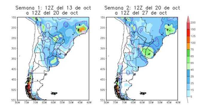 Mientras que para la semana del 20 al 26 de octubre, existe una baja probabilidad de ocurrencia de precipitaciones del orden de los 5 milímetros por día, en el tramo medio de la cuenca del río Uruguay del 21 al 24 de octubre. Los modelos numéricos no muestran precipitaciones importantes para el resto de las cuencas bajo vigilancia a lo largo de esta segunda semana de pronóstico.