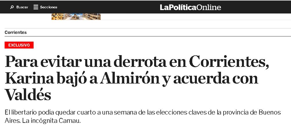 El medio La Politica Online publicó en la noche del domingo que, por orden de Karina Milei, se bajó la candidatura del referente libertario en Corrientes Lisandro Almirón.